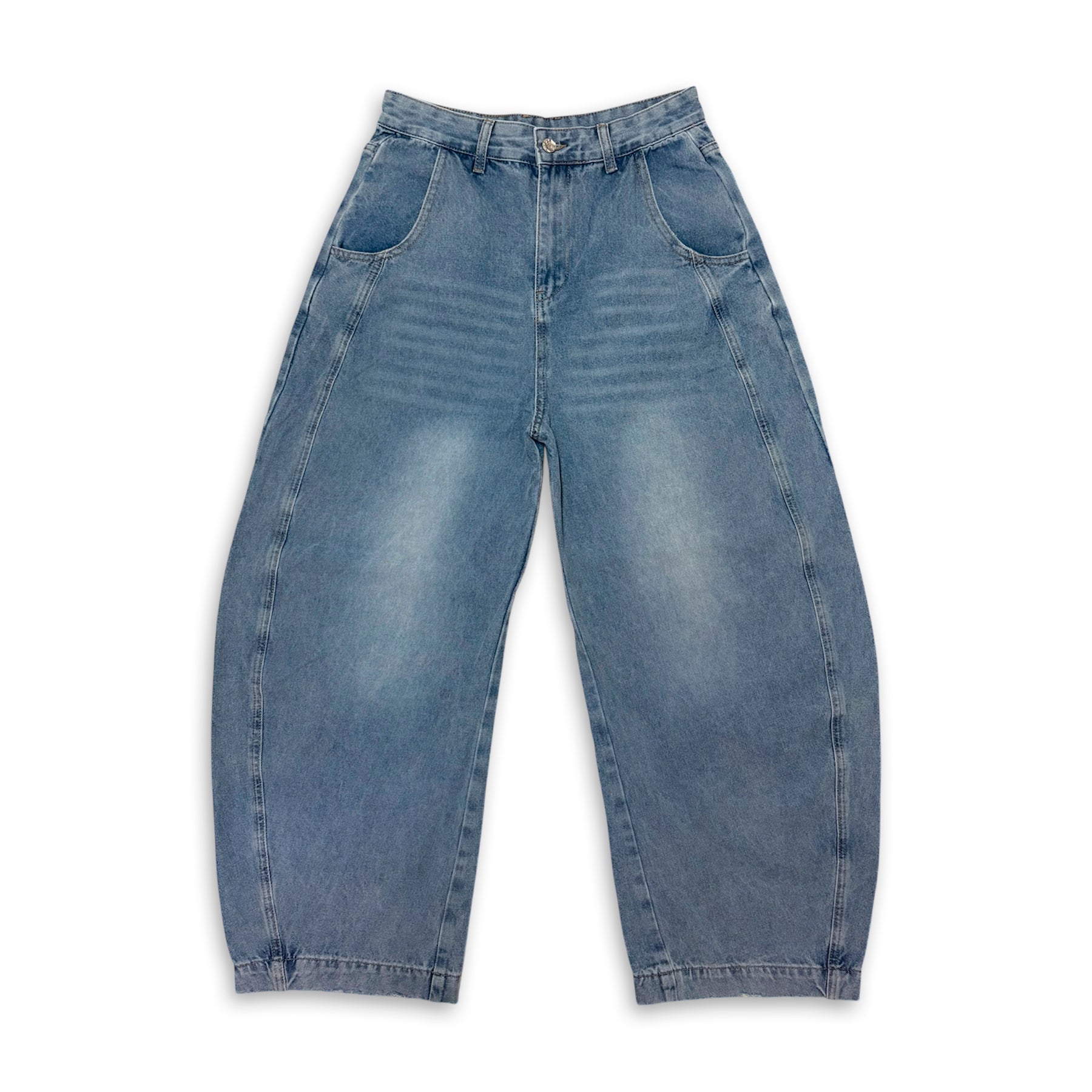 裾に向かってカーブがかかったバレルシルエットデニム。バックにはオリジナルの紙パッチ付き。裾やポケット部分にダメージ加工を施しています。