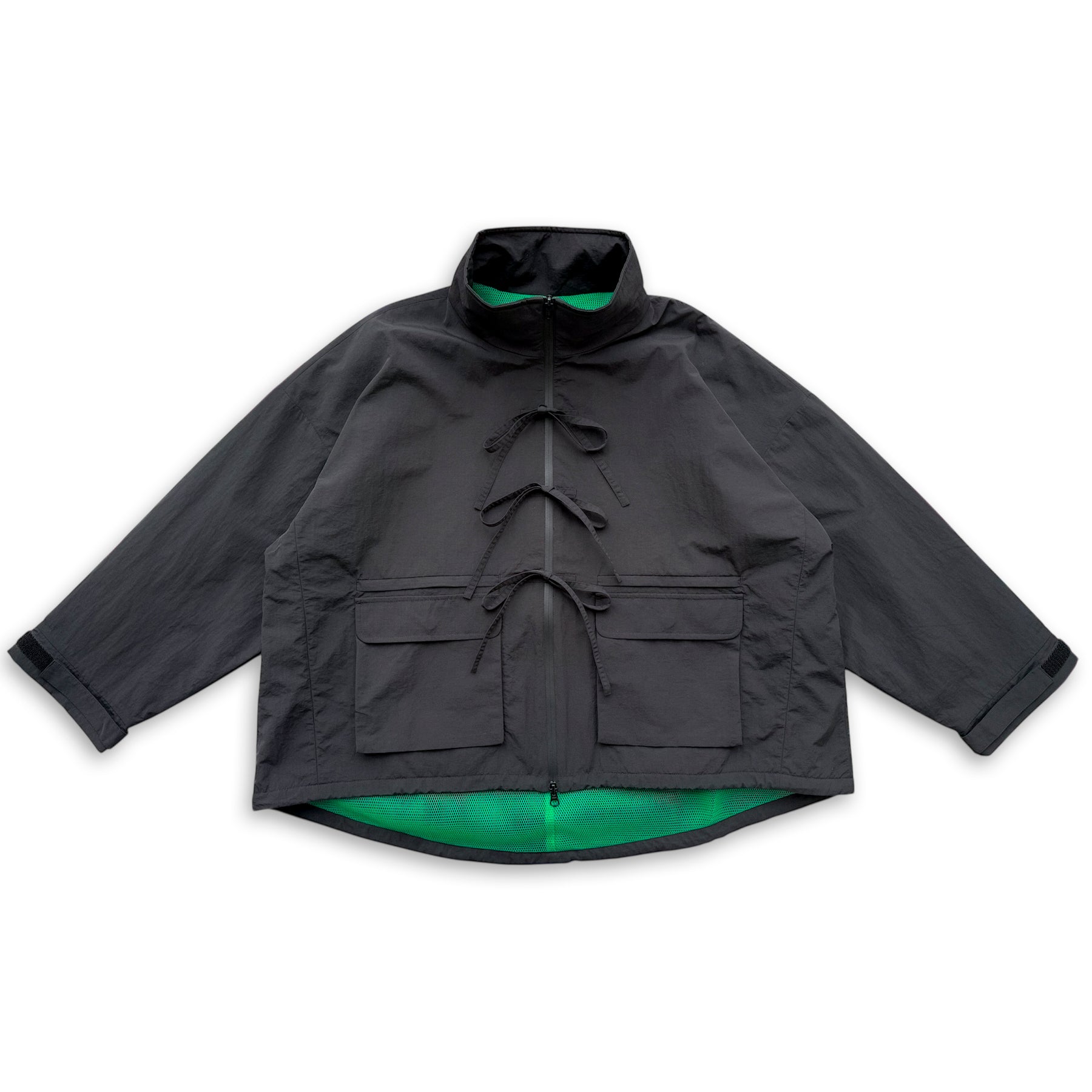 短めの丈とゆったりとした身幅で、存在感のあるシルエットに仕上げたジャケット。フロントの紐が程よいアクセントになっています。表地には撥水ナイロン、裏地には厚みのある立体メッシュを採用し、保温性と通気性、そして快適な着心地を両立しました。前面に4つ、背面に大型ポケット1つを備え、必要な荷物をしっかり収納できます。