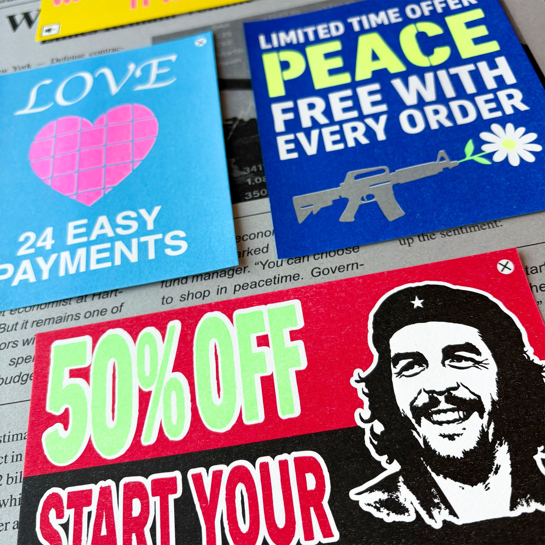この作品は、「戦争は景気を押し上げる」という冷徹な市場視点の記事を背景に、その上から「革命」や「平和」といったスローガンを "広告の形" にして重ねています。