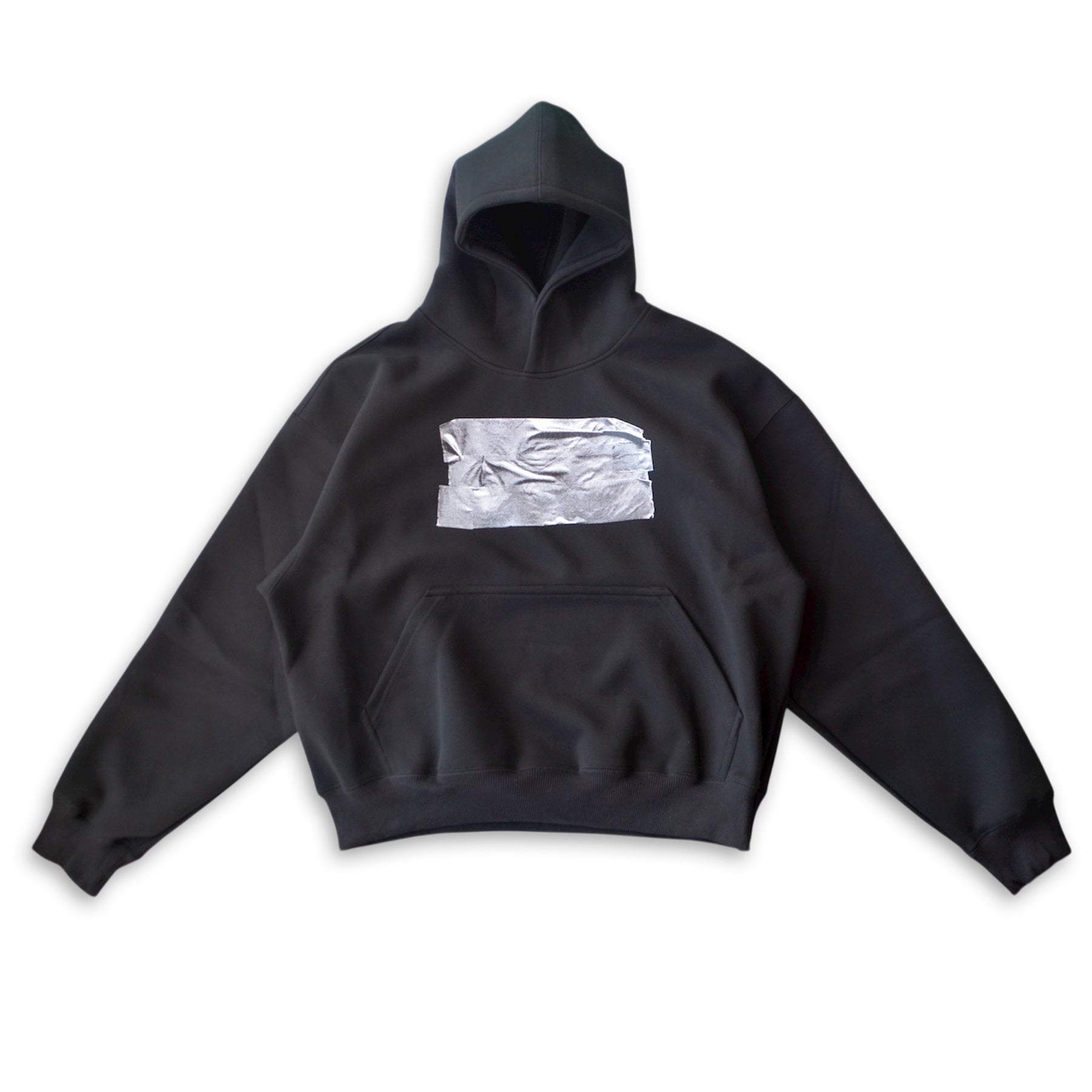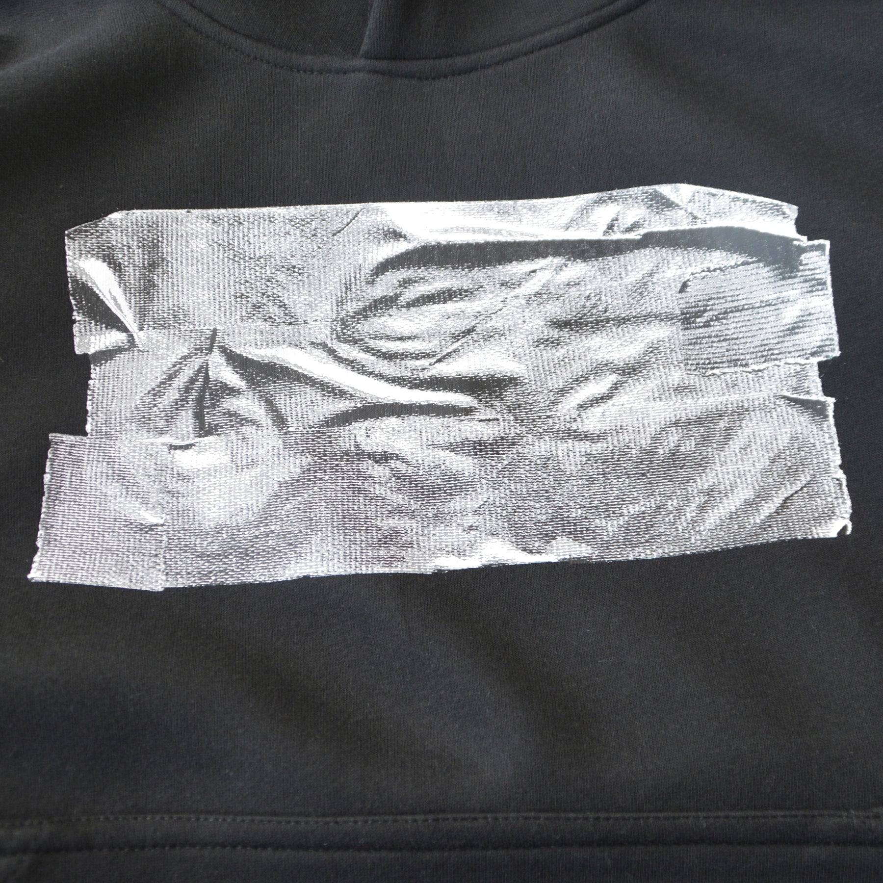 ボックスシルエットのヘビーウェイトフーディ。海外のコピー商品市場で警察が取り締まりを行う際、販売者がロゴをテープで隠す手法から着想を得ています。黒・グレー・白の3色でテープの質感を表現しました。
